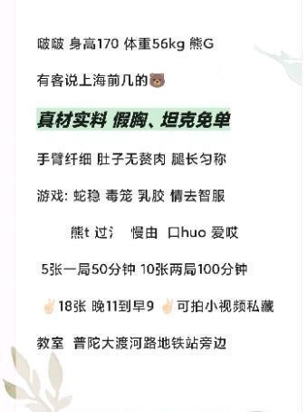 前段时间加的,妹子比较小心全程遥控上口开门后第一映入眼帘的就是大胸就是那种av里的绝对是g奶而且是天然的,闲聊几句自己洗澡,洗完以后会帮擦后背而且会帮擦脚,铺好一次性卫生纸开始背面,胸推的时候就感觉那种柔软的感觉,然后my 会问你要不要dl dl也是很卖力,然后翻正面,一对大奶闷在脸上相当的解压,kh也是温柔型的这种胸要求了一下乳交然后带雨伞开干就看到大奶一顿摇晃换后入输出一会儿换正面抓奶出货,最后付水费走人总体相当超值